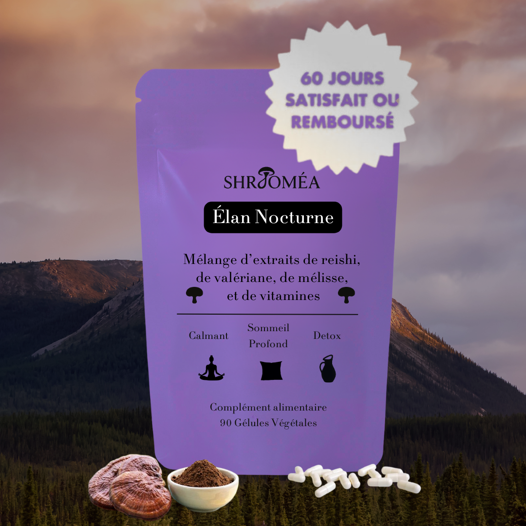 Pour compléter le Reishi, j’ai associé ce champignon à des vitamines du groupe B (B2, B6, B12), et C, reconnues pour leur rôle dans le bien-être général. C’est ce duo qui m’a inspiré à créer Élan Nocturne, une formule naturelle phare de la marque Shrooméa, pensée pour accompagner vos routines de détente pré-sommeil.